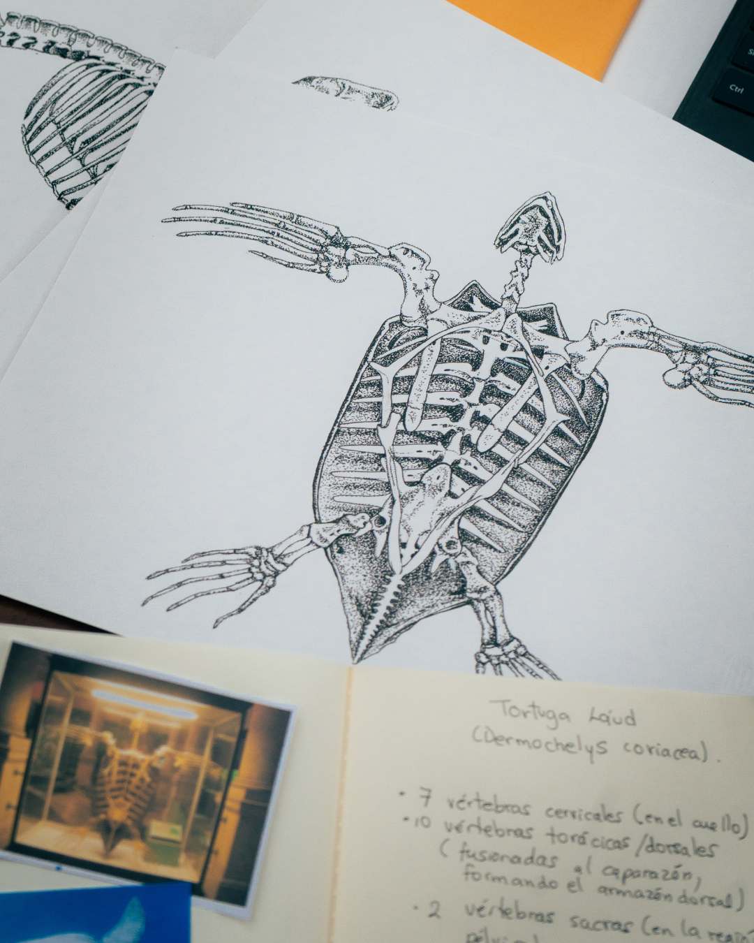Junto a la artista científica Martha Espinoza (ASBA) transformamos siete especies emblemáticas de Costa Rica —jaguar, danta, tortuga baula, perezoso de dos dedos, tiburón martillo, tucán y rana de ojos rojos— en ilustraciones óseas. El resultado es un espejo incómodo de lo que podríamos perder si no hacemos nada.